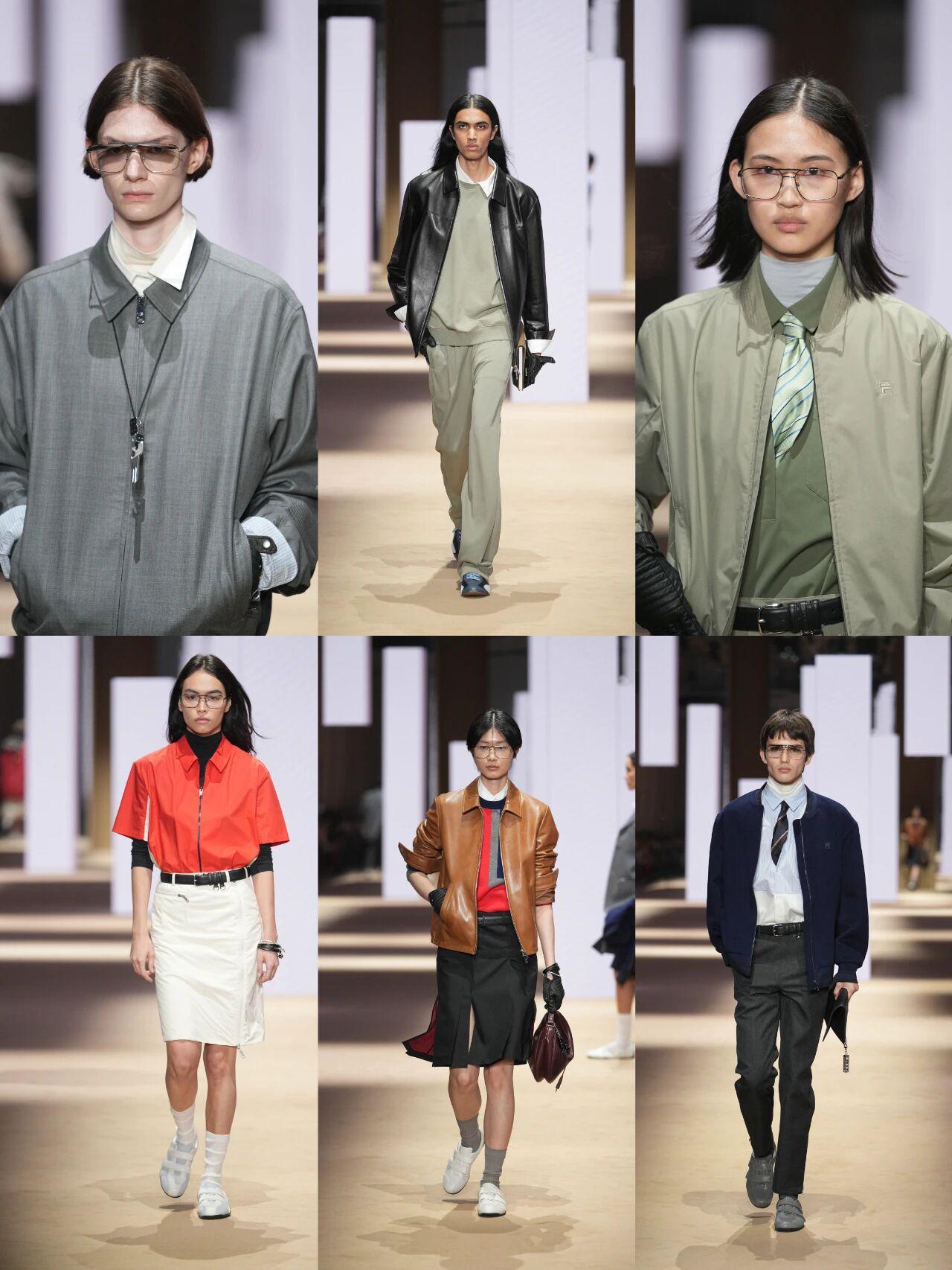 再看本次整场的大秀,它分为五个章节,对应米兰五个地标的节奏:新门商务区的严谨、布雷拉街区的松弛、纳维利运河区的活力、博维萨校区的革新、米兰大教堂的仪式感。串起来看,就是一个人从周一到周末、从早到晚的生活切换——FILA把这套逻辑叫作“高智运动风”,但说到底,只是让衣服跟着人走,而不是人跟着衣服换。值得注意的是,整个系列的设计语言中,除了FILA标志性的红白蓝,还融入了米兰城市特有的灰调、棕色、橄榄绿和米色,让服装更贴合都市的日常氛围。