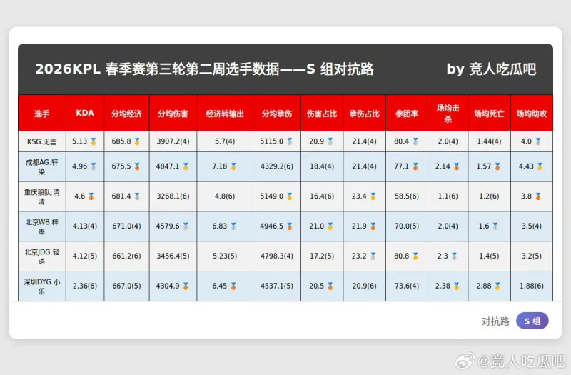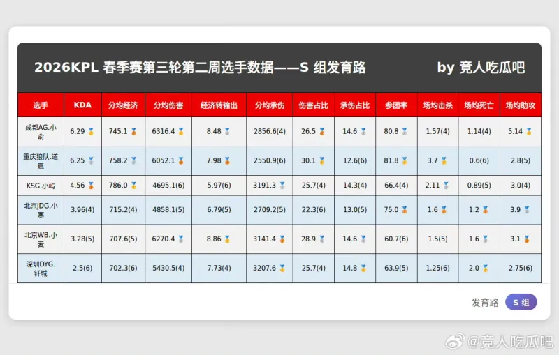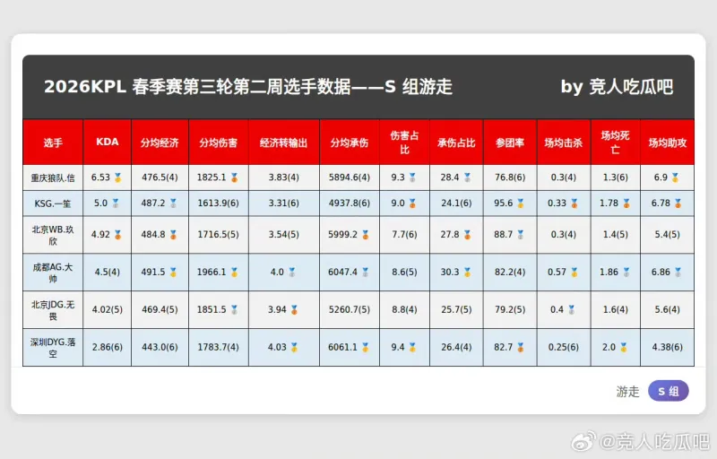 春季赛S组最新数据,大家觉得谁会入选周最佳阵容?
